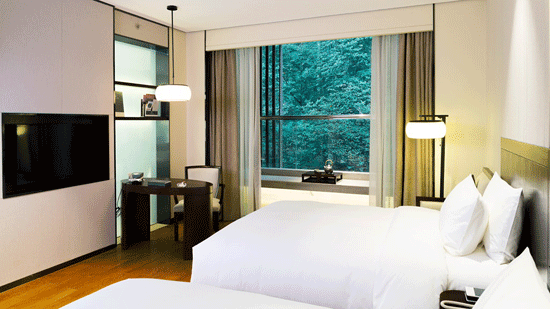 酒店占地面積約48,800㎡,總建筑面積35,000㎡。酒店內地形以坡地為主,高差較大,周邊山林植被茂盛,樹種主要以楠木,香樟為主,綠化、景觀環境優美,“進享繁華,退居森林”,為成都近郊不可多得的高品質酒店資源。酒店聘請知名建筑設計、裝修機構,采用新中式結合元素,顛覆傳統設計、按照國際五星級標準設計建設,是文化交流、文化創意、會議展覽、教育培訓、度假康養最理想的去處。